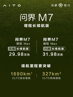 同日,全新问界M7增程长续航版正式上市,其中增程Max五座长续航版售价29.98万元起,增程Max六座长续航版售价31.98万元起,即刻下定,可享受至高60000元购车权益。